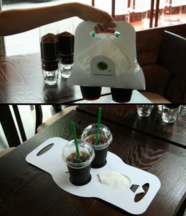 С этой креативной сумкой, разработанной Sonyun Kang, можно будет носить несколько напитков в одной руке. А делают такие сумки за копейки из картона.