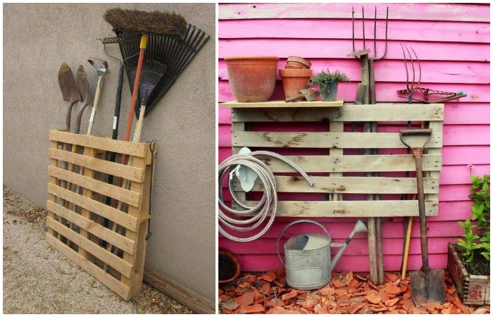 Из палетов легко соорудить множество вариантов удобных систем хранения. Самый простой — прикрепить поддон к стене, и вставлять садовый инвентарь в него. Из крупных палет получится сделать аналог стеллажа.