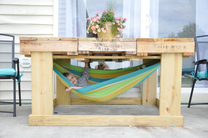 Из нескольких палетов и деревянных досок несложно соорудить место для детского отдыха. Его можно использовать как небольшой навес. А если прикрепить к вертикальной части гамак из плотной ткани — то такая конструкция станет любимым местом отдыха детей.