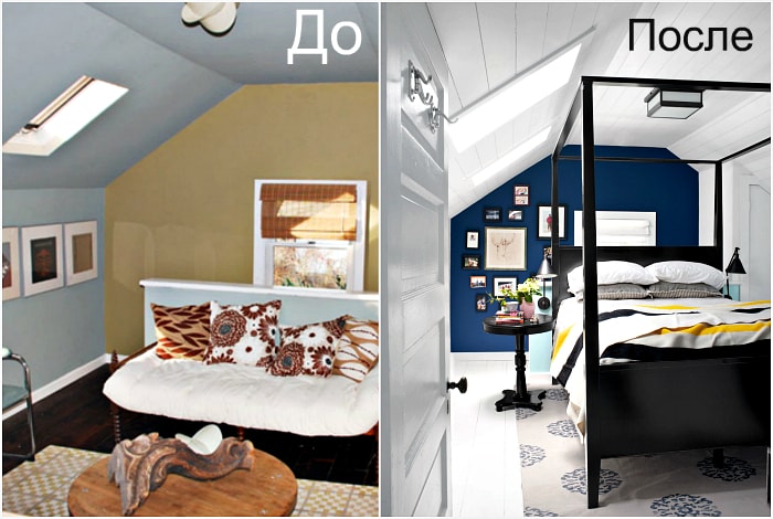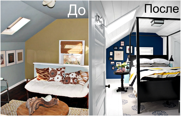 Потрясающее преображение крошечной мансардной спальни с помощью ярких контрастных деталей, вроде насыщенно синей акцентной стены и великолепной черной мебели.