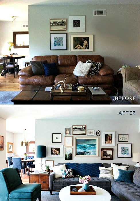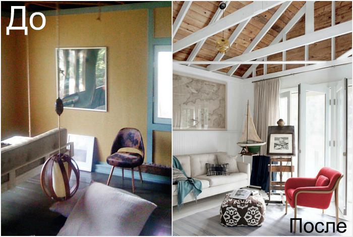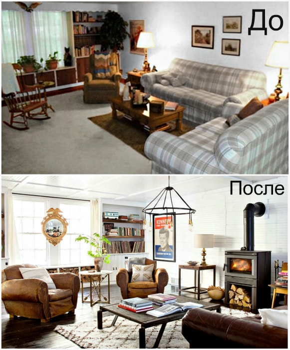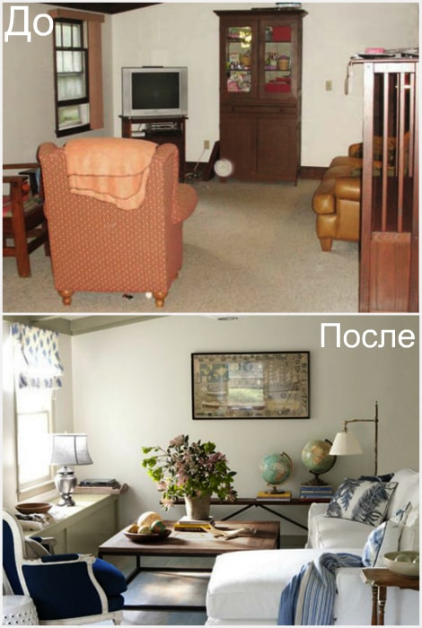 Тотальное превращение скучной гостиной, загроможденной ветхой мебелью, в стильное пространство со светлыми стенами, широким подоконником, современной мебелью и множеством очаровательных деталей.