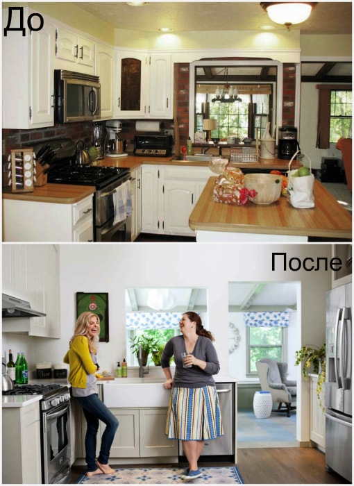 Новое освещение, белоснежный кухонный гарнитур и ковер вместо громоздкого островка позволили создать стильный и просторный интерьер кухни.