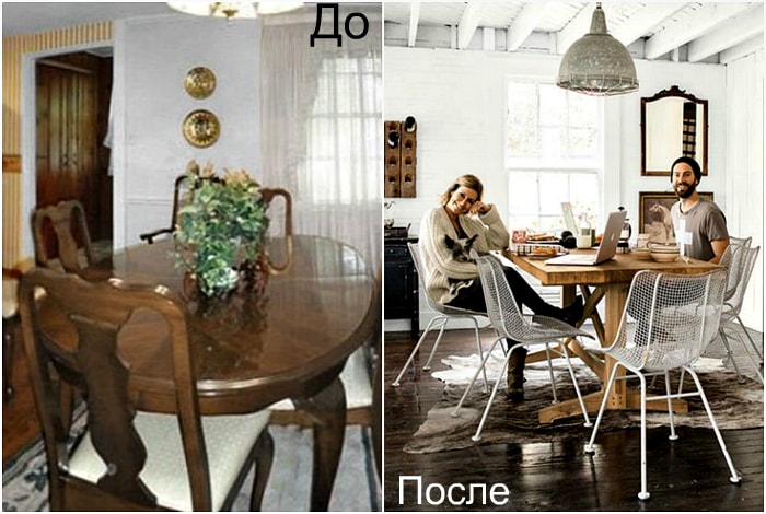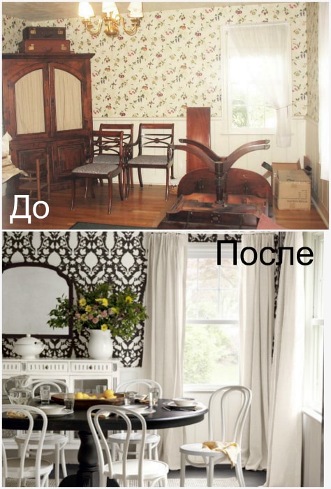 Замена обоев и мебели, а также элегантные льняные шторы вместо простеньких занавесок позволили полностью изменить динамику помещения и превратить выставку антиквариата в уютную и современную столовую.