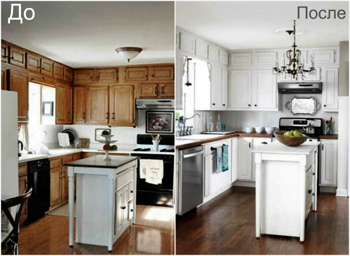 Аккуратная покраска деревянных кухонных шкафчиков в белый цвет, замена черной бытовой техники на ее аналоги серебристого цвета и роскошная люстра позволили освежить скучное кухонное пространство.