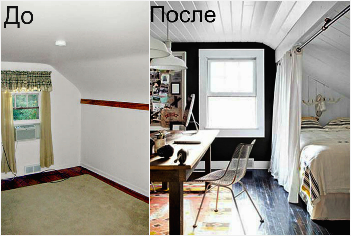Чудесное превращение пустующего мансардного помещения в стильную гостевую спальню в черно-белых тонах с небольшой кроватью, отделенной шторкой, и массивным деревянным столом в рустикальном стиле.