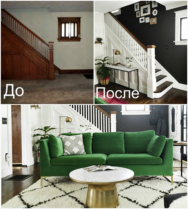 Контрастная черно-белая покраска элементов лестницы и стен прилегающей к ней территории, роскошный бархатный диван сочного зеленого цвета, столы с мраморными столешницами и обилие золотистого декора позволили превратить невзрачную прихожую в стильную гостиную.