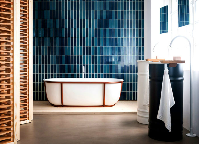 Грамотное сочетание двух оттенков глянцевой керамической плитки и натурального дерева позволили создать невероятно динамичное и в то же время уютное пространство.