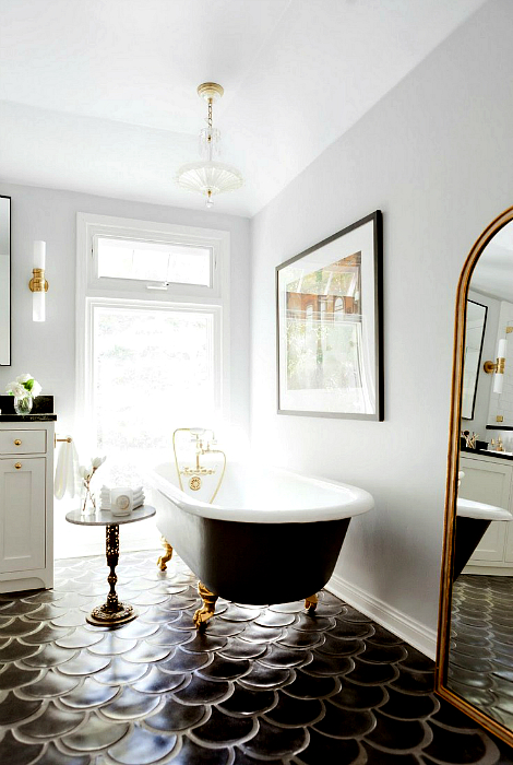 Просторная ванная комната с большим напольным зеркалом, белоснежными стенами и контрастным темным полом, отделанным ультрамодной плиткой, похожей на рыбью чешую.