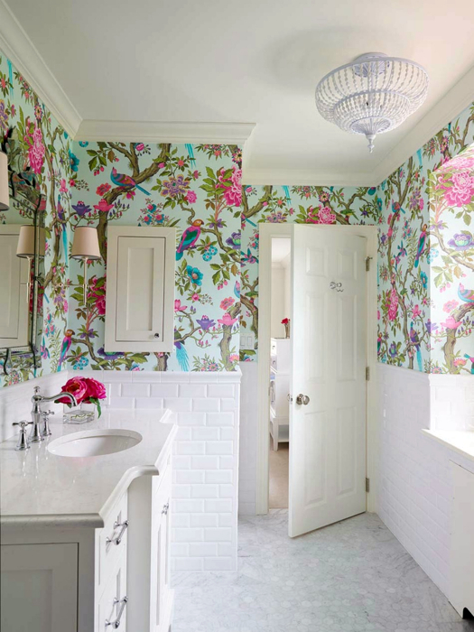 Свежий и просторный санузел, стены которого украшает сочетание белой керамической плитки и красочных обоев с флористическим принтом.