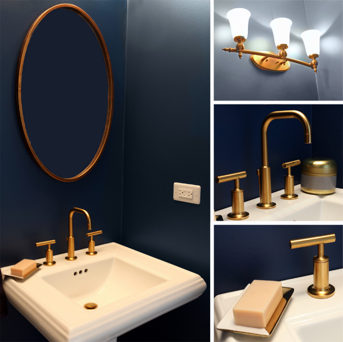 Элегантная ванная комната с великолепными темно-синими стенами и обилием ультрамодных золотистых акцентов в виде смесителя, настенного светильника и рамы зеркала.