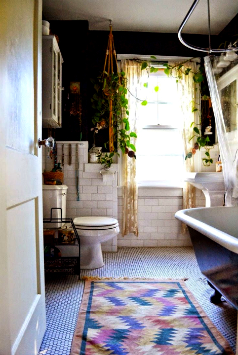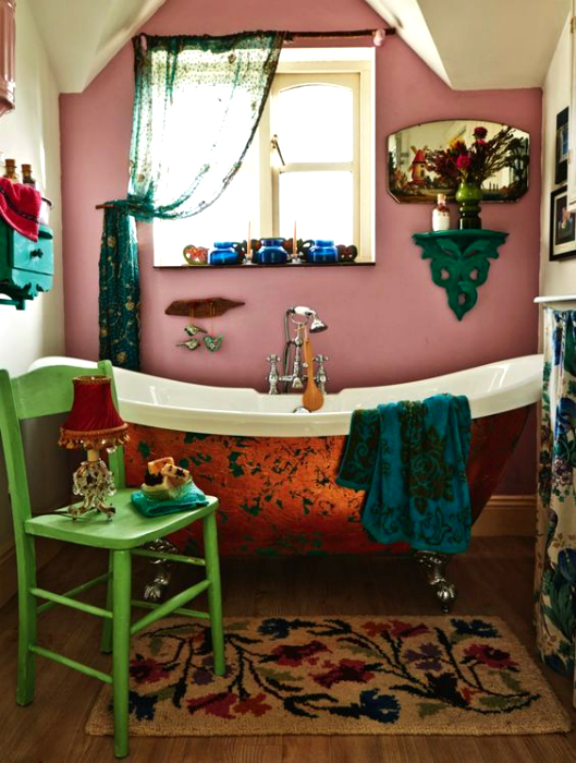 Великолепный санузел в стиле бохо, изюминкой которого стала большая ванна с эффектом потрескавшейся меди.