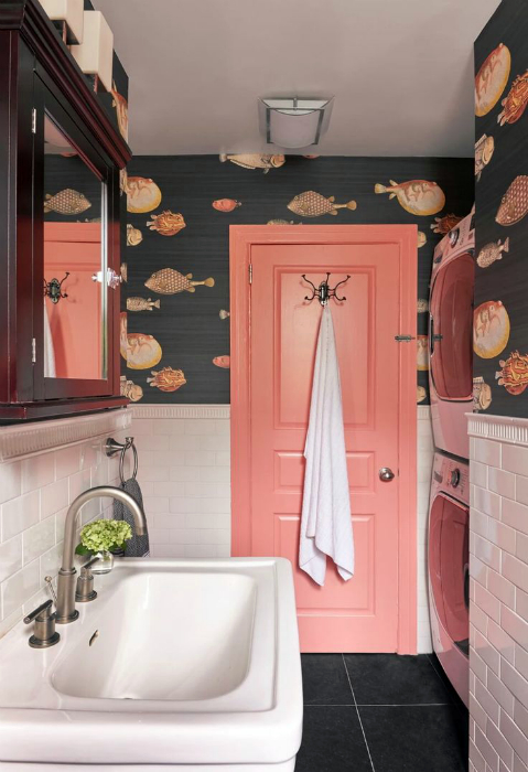 Небольшая ванная комната с эффектными темными обоями, украшенными забавными изображениями рыбок и броской розовой дверью.