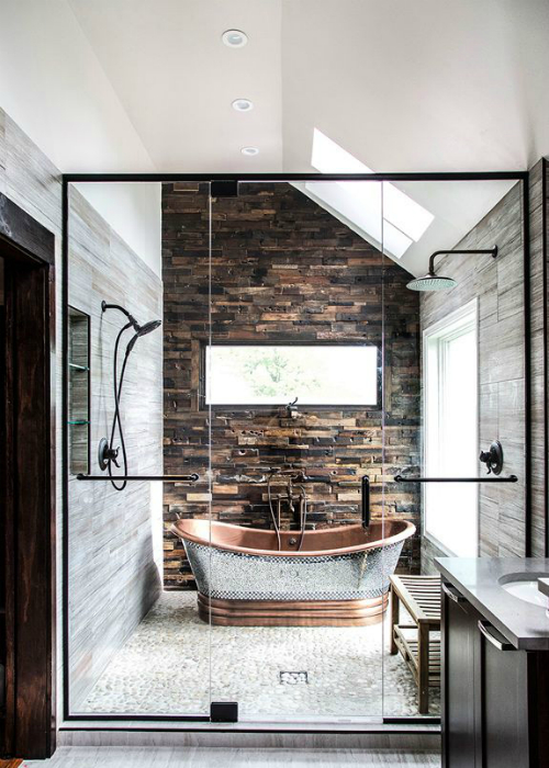 Великолепный санузел с элементами рустикального стиля в виде деревянной и кирпичной отделки стен и роскошной блестящей ванной в стиле модерн.