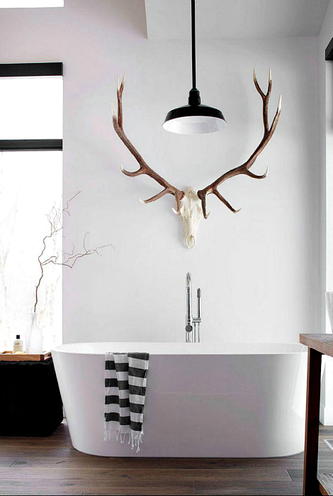 Просторная ванная комната в актуальном сегодня скандинавском стиле, с белыми стенами, деревянным полом и эффектным черепом на стене.
