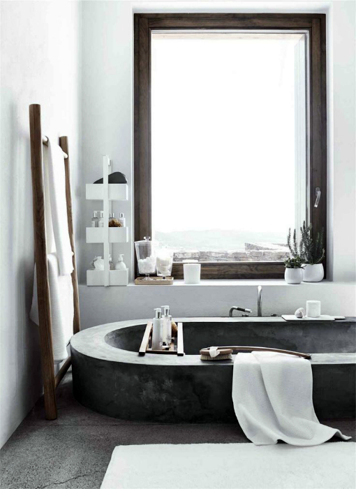 Минималистичный интерьер ванной комнаты, особенностью которой стала фантастическая встроенная ванна с грубым бетонным бортиком.