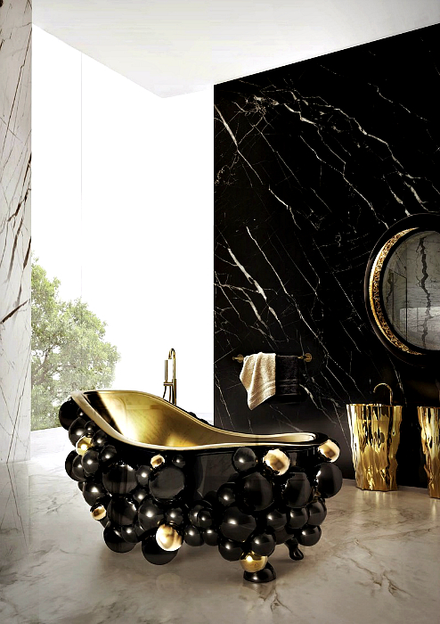 Потрясающий дизайнерский интерьер ванной с акцентной черной стеной, фантастической золотой сантехникой и фурнитурой и великолепной ретро-ванной, украшенной объемными пузыриками черного и золотого цвета.