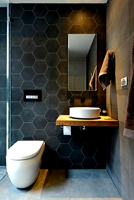Стильный и лаконичный дизайн санузла, стены которого украшает ультрамодная керамическая плитка в форме сот элегантного серого цвета.