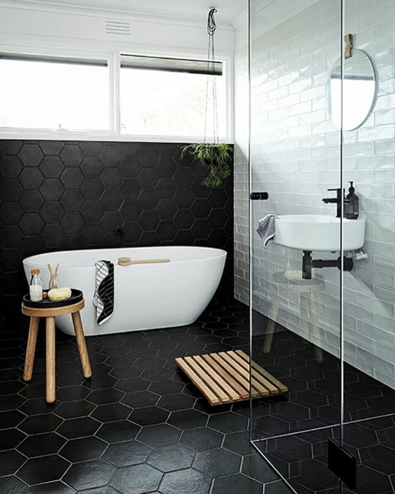 Стильный санузел для отделки которого использовали классическую белую плитку в виде кирпичиков и ультрамодную черную в виде сот, дополнив все это современной сантехникой и небольшими, но значимыми деревянными деталями.