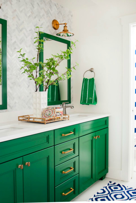 Санузел, оформленный в бело-зеленых цветах, что делает его необычайно свежим, а блестящая золотистая фурнитура привносит в интерьер нотки стиля и элегантности.