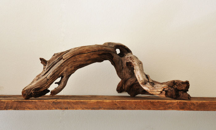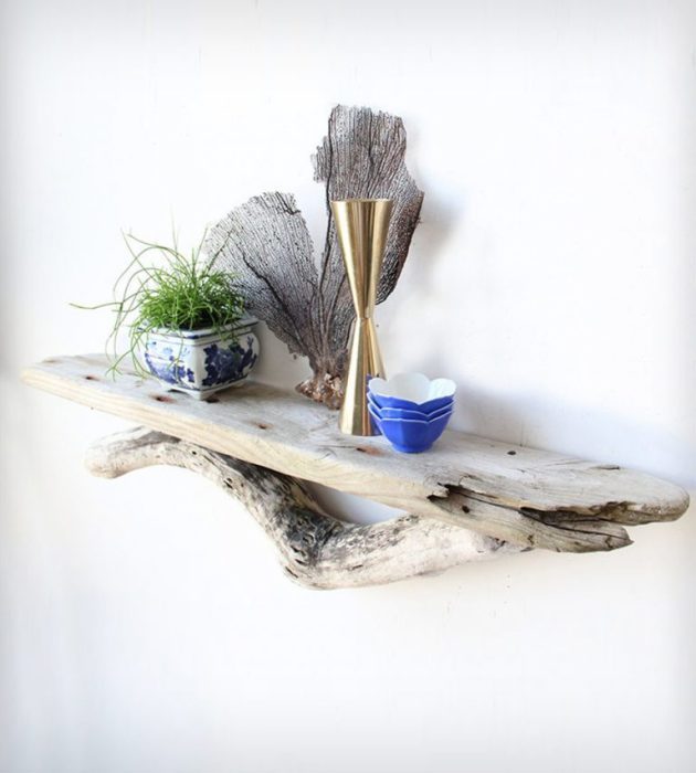 Обработанные коряги хорошо подойдут для создания настенных полочек или стеллажей.