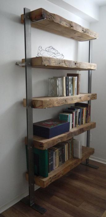 Стеллаж из натурального дерева и металла в современном интерьере.