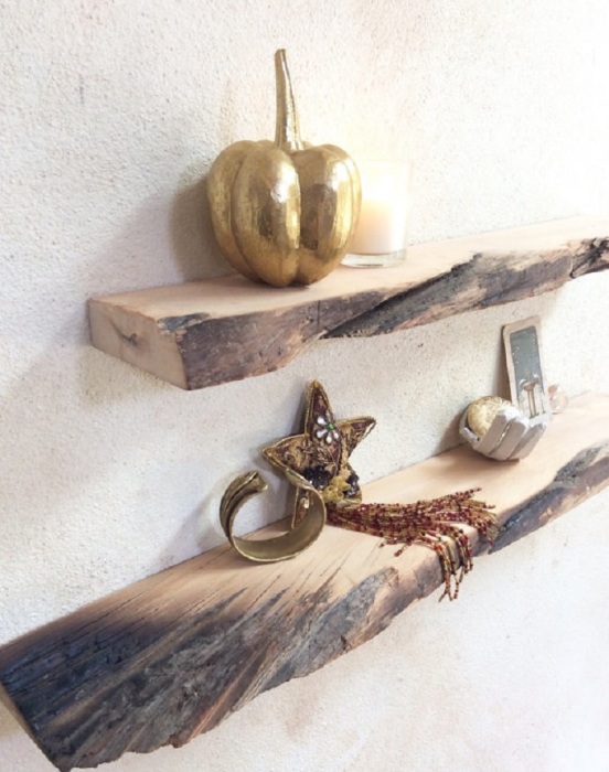 Настенные полки из необработанного дерева сейчас на пике популярности.