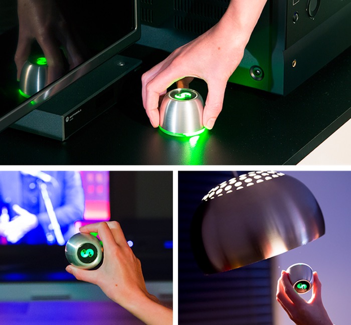 Универсальный пульт носит название Spin Remote. У него действительно нет ни одной кнопки, вместо них набор датчиков (таких, как гироскоп и акселерометр) и сенсорная панель. Все манипуляции пультом проводятся за счет перемещения им в пространстве. Нужно сделать звук громче? Кладем пульт на прямую поверхность и поворачиваем в одну из сторон. Нужно изменить свет в комнате? Поднимаем пульт в воздух и также поворачиваем. Сменить клана – легко, просто рисуем цифру на сенсорной панели.