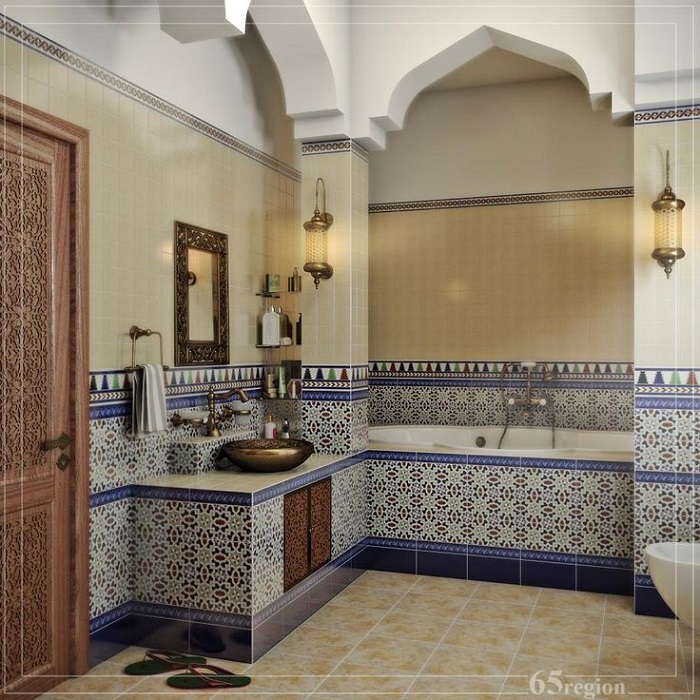 Сегодня дизайнеры советуют использовать марокканскую штукатурку таделакт для отделки не только стен, но и ванной, и раковины. Эта штукатурка прекрасно ложится на глиняные, известковые, цементные, гипсовые поверхности и при этом имеет отличные водоотталкивающие качества. К тому же, в состав штукатурки можно добавить краску, что в разы увеличивает ее практичность и функциональность.