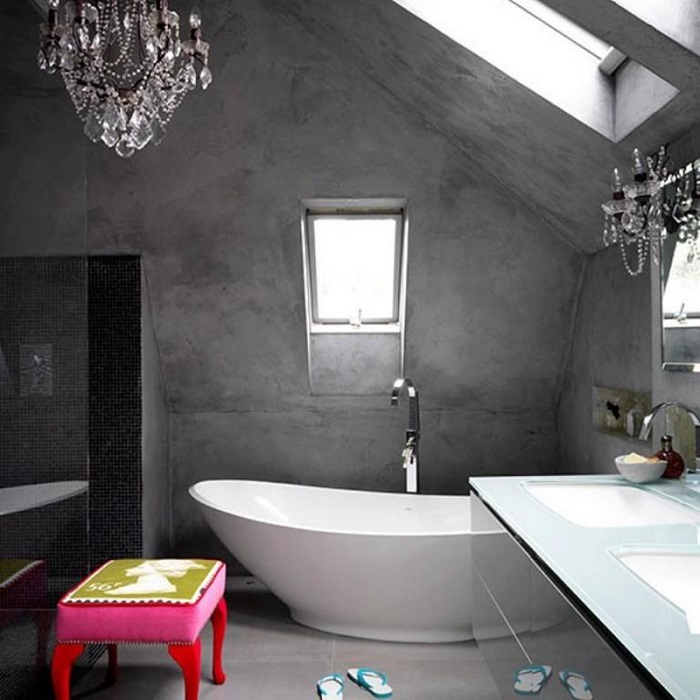 Дизайнеры все чаще предпочитают использовать бетон в качестве отделочного материала для стен. Особенно, если речь идет о модном ныне стиле лофт. Ванная комната, выполненная полностью из бетона, будет смотрится очень стильно, особенно, в квартире холостяка. А для того, чтобы спрятать трубы, можно использовать инсталляции.