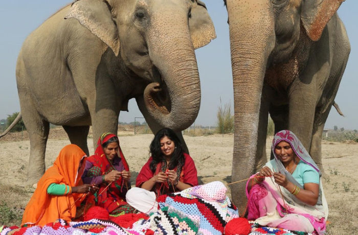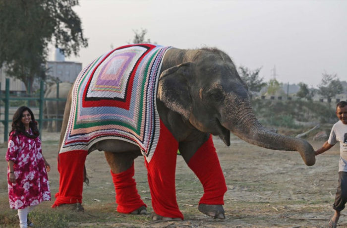 В одном из центров по охране дикой природе на севере Индии зима выдалась холодной. Слонов решили согреть тёплой одеждой. На создание одного свитера у добровольцев уходит около четырёх недель.