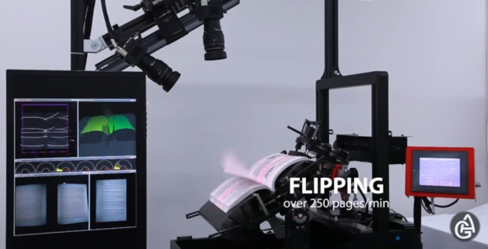 Работает все благодаря набору лазерных датчиков, трем «умным» камерам и специальной подкатке, которая умеет листать страницы. Хотите отснять «Войну и мир», кладите книгу и все будет готово до того, как вы успеете заварить себе чашечку кофе.