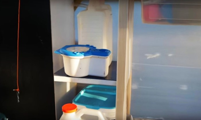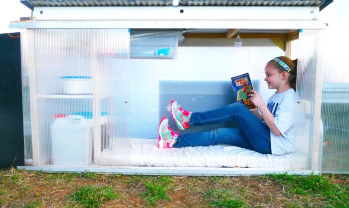 Домик, который Кэлли назвала свой Callie’s Coop, состоит из двух функциональных зон. Одна из них предназначена для сна, а в другой находится компостный туалет и маленькая печка, которая функционирует от энергии солнца. В домике под матрасом есть контейнер для вещей. Освещение осуществляется за счет маленькой лампочки, питаемой пятивольтной солнечной панелью.