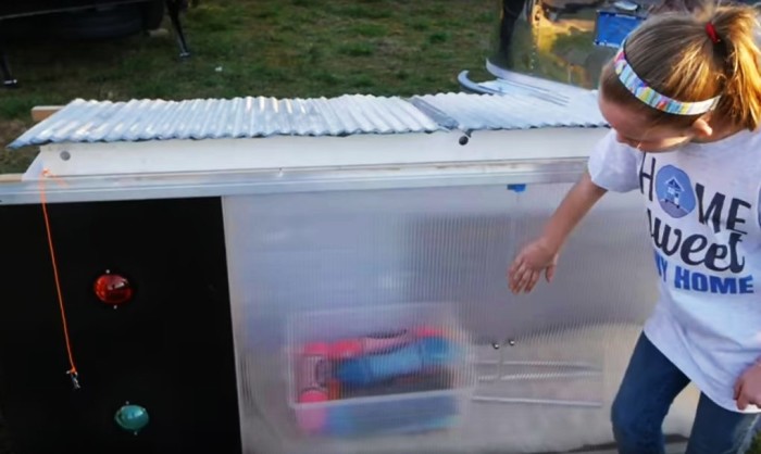 В крошечном доме есть своя система сбора дождевой воды. Крыша сделана под наклоном, поэтому струйки воды стекают вниз по трубе, собираясь в специальной емкости. Девочка продемонстрировала, что жилище совсем не тяжелое. Его вес составляет примерно 12 килограммов.