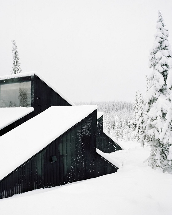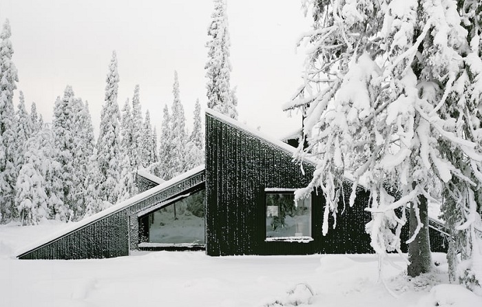 В норвежской коммуне Лиллехаммер в лесу расположен жилой дом в виде нескольких остроконечных объемов. Создавая этот проект, архитекторы вдохновлялись очертаниями жилищ в заснеженную зиму, когда после обильного снегопада видны только крыши домов. Получилось очень нестандартно и эффектно.