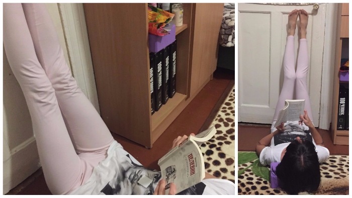 А вот это действительно простая и очень удобная поза, потому что во время ее выполнения можно параллельно заниматься другими делами— читать книгу, бороздить просторы интернета на смартфоне, смотреть любимую телепередачу и т.п. Хотя расслабление и закрытые глаза все равно остаются в приоритете. Лягте на пол рядом со стеной, подложите под голову невысокую подушку, а ноги запрокиньте на стену. Лежать в такой позе можно сколь угодно, но первое время выдержать ее длительное время, скорее всего, будет тяжело, поэтому время можно будет увеличивать постепенно.
