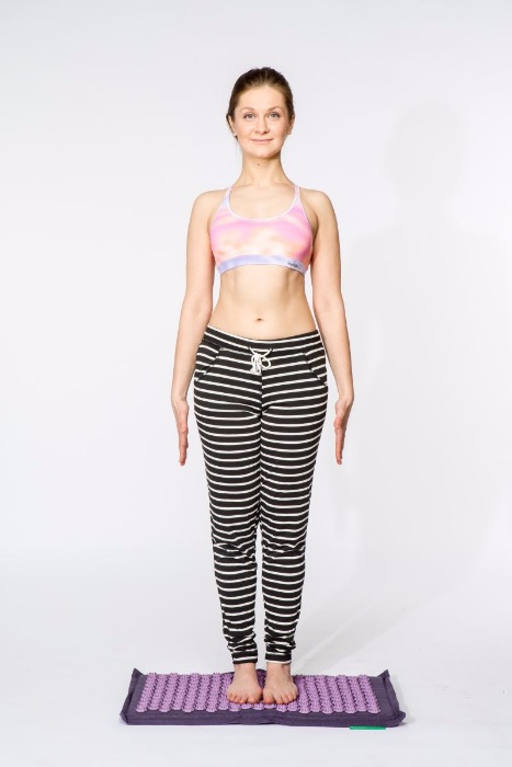 С виду, поза очень простая, но и у нее есть свои правила. Ладони в этом случае должны тянуться к полу, а не просто «висеть» параллельно телу. Подбородок нужно максимально втянуть (так, чтобы образовался «второй» подбородок), макушку потянуть вверх, а копчик следует подтянуть под себя, чтобы в пояснице образовался прогиб. Стоять следует так, чтобы большие пальцы на ногах соприкасались друг с другом, а пятки находились на расстоянии 5-6 см. Такая позиция поможет телу расслабиться, особенно шее и плечам. Тадасана будет полезна людям с сидячей профессией, тем более, что выполнять упражнение можно прямо в офисе во время перерыва.