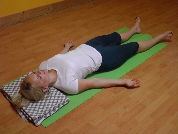 Еще одна обманчиво простая позиция с некоторыми рекомендациями. Чтобы выполнить ее правильно, нужно лечь на спину и развернуть ладони к потолку. Ноги положить произвольно, чтобы те были немного шире плеч. Подбородок подтягивается к груди так, чтобы возникло чувство образования «второго подбородка». Рот немного приоткрыть, а глаза закрыть. Кончик языка рекомендуется удерживать прижатым к верхнему небу.
