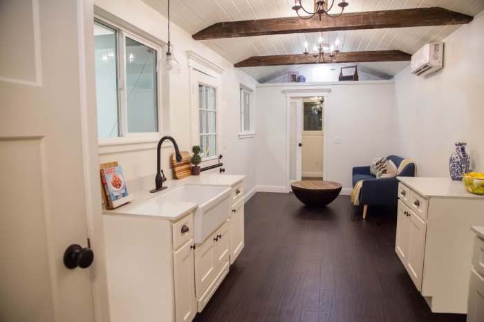 Внутри дома English Rose все также выполнено по высшему классу. Большая площадь позволила расположить просторную спальню, кухню и гостевой модуль. Внутри дома есть кладовая, с множеством отделений для хранения самых разных вещей. В отдельной комнате расположен санузел с туалетом и душевой. Отдельного упоминания заслуживает пол из бамбука. Нельзя не вспомнить и про опускаемый железный помост, на котором может быть организована небольшая терраса перед коттеджем на колесах.