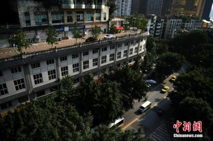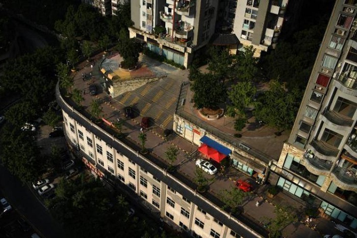Судя по всему, 5-этажный дом с трассой на крыше прекрасно вписывается в список необычных строений Чунцина. Оказывается, дорога была создана для того, чтобы жители близлежащего дома могли попасть в свои квартиры, в противном случае им придется использовать наземный лифт. А так жители оставляют свои автомобили тут же на парковке крыши и отправляются к себе домой.